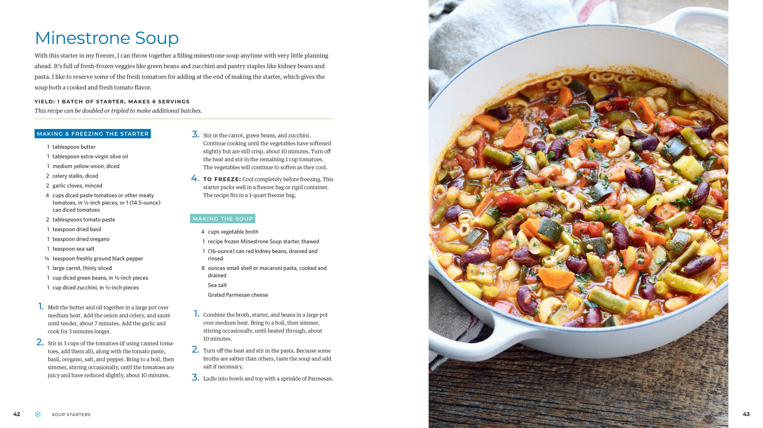 In this book you’ll find recipes for prepared baked goods, soups, sauces, vegetable side dishes, cooked fruits, pie fillings, jams, and frozen treats. You’ll also find recipes for “starters,” which is one of my most beloved categories to freeze. A starter is typically the vegetable and herb portion of a recipe cooked together and frozen. There are soup starters, meal starters, and even dip starters! It’s a way to preserve the fresh ingredients you have now but not take up more freezer space than necessary. Making the dish is as simple as thawing the starter and adding pantry staples or refrigerated ingredients to complete it. It’s the ultimate meal prep and the perfect balance of home-cooked and convenient!