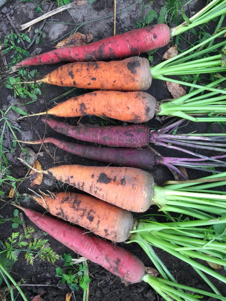 I keep trying other purple carrot varieties and am continually disappointed by them. Cosmic Purple is a reliable favorite! It is deep purple, sometimes almost brownish purple on the outside, with a yellow and orange center. They are stunning when cut into coins, and they’re always delicious! They keep decently in the refrigerator, though not as long as traditional “long keeper” varieties like Danvers.