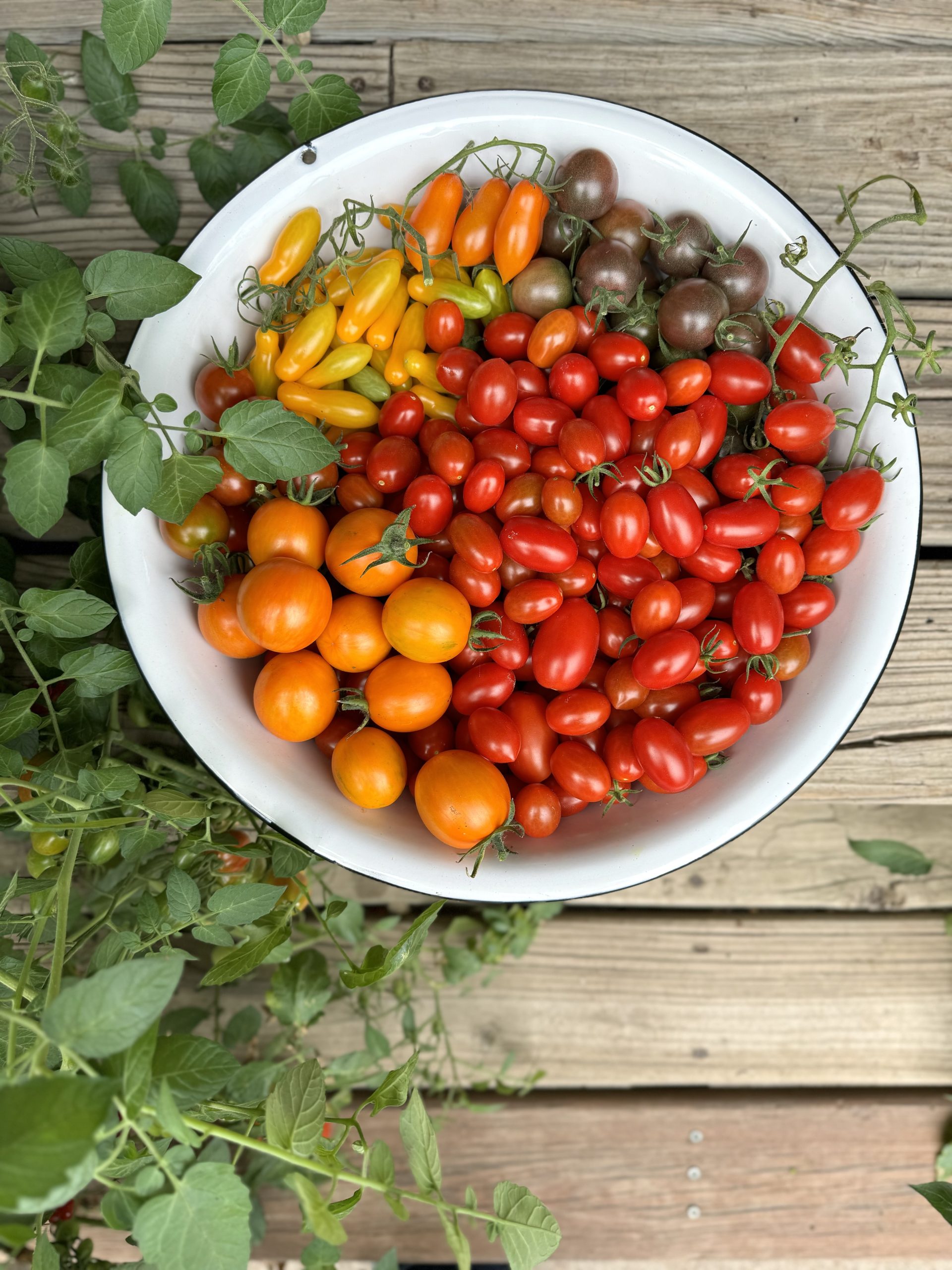 If I could only grow one tomato, it would be this one. It’s wildly prolific– it’s the first tomato to produce in the spring, and the last to stop in the fall. She’s an absolute work horse! Juliet tomatoes are often described as a “small roma,” so they are bigger than a standard cherry tomato but smaller than most paste tomatoes. They excel at everything… I use them for saucing, making fresh salsa, slicing on salads, and they’re my absolute favorite for making oven-roasted sun-dried tomatoes.