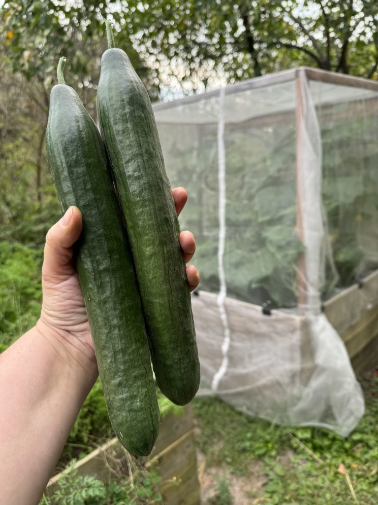 This is a long, dark green, english-style cucumber (like the ones you get wrapped in plastic at the grocery store). They always look stunning and perfect, and they have good flavor. However, one of the main reasons I grow this variety is because it is parthenocarpic, which means it doesn’t need to be pollinated to make fruit (I’ve tried several and this is the best parthenocarpic slicing variety I’ve found). This allows me to grow the plants under netting and protect them from cucumber beetles, which have a pretty bad time with here.
